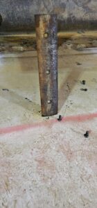 バケットの先端についているカッティングエッジを取外しました。この部品は作業している時に摩耗して消耗していく大事な部品です。これがなくなるとバケット本体が摩耗してしまい、作業に支障がでてしまうので消耗し